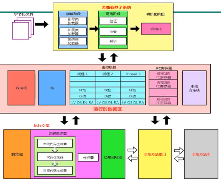 执行引擎包含三部分:解释器,及时编译器,垃圾回收器
