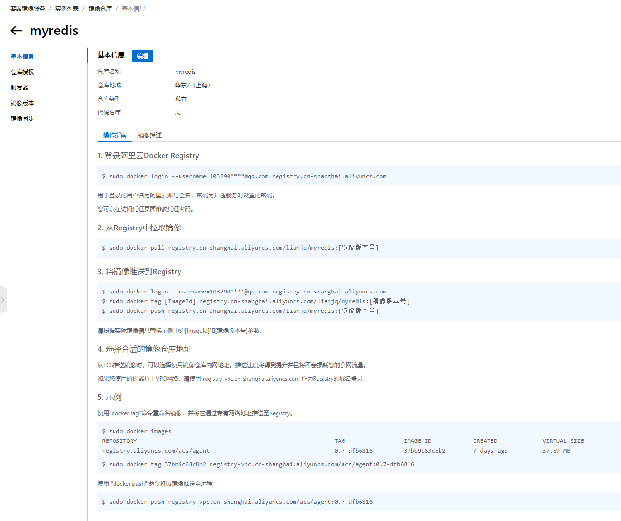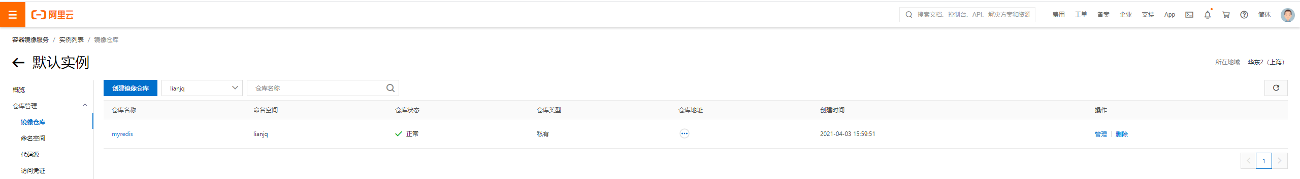 Login Succeeded [root@quan ~]# docker tag 0a7a7dca8c28 registry.cn-shanghai.aliyuncs.com/lianjq/myredis:1.1.2 [root@quan ~]# docker push registry.cn-shanghai.aliyuncs.com/lianjq/myredis:1.1.2 The push refers to repository [registry.cn-shanghai.aliyuncs.com/lianjq/myredis] b2ee95f92839: Pushed 3480f9cdd491: Pushed a24a292d0184: Pushed f927192cc30c: Pushed 1450b8f0019c: Pushed 8e14cb7841fa: Pushed cb42413394c4: Pushed 1.1.2: digest: sha256:11e88398a0298e90308e68c58082ec92eb70dd30919a523e2b98e2fec9b4973a size: 1779 [root@quan ~]# docker images REPOSITORY TAG IMAGE ID CREATED SIZE myredis 1.1 0a7a7dca8c28 28 minutes ago 104MB redis latest 621ceef7494a 2 months ago 104MB [root@quan ~]# docker pull registry.cn-shanghai.aliyuncs.com/lianjq/myredis:1.1.2 [root@quan ~]# docker images REPOSITORY TAG IMAGE ID CREATED SIZE myredis 1.1 0a7a7dca8c28 28 minutes ago 104MB registry.cn-shanghai.aliyuncs.com/lianjq/myredis 1.1.2 0a7a7dca8c28 28 minutes ago 104MB redis latest 621ceef7494a 2 months ago 104MB